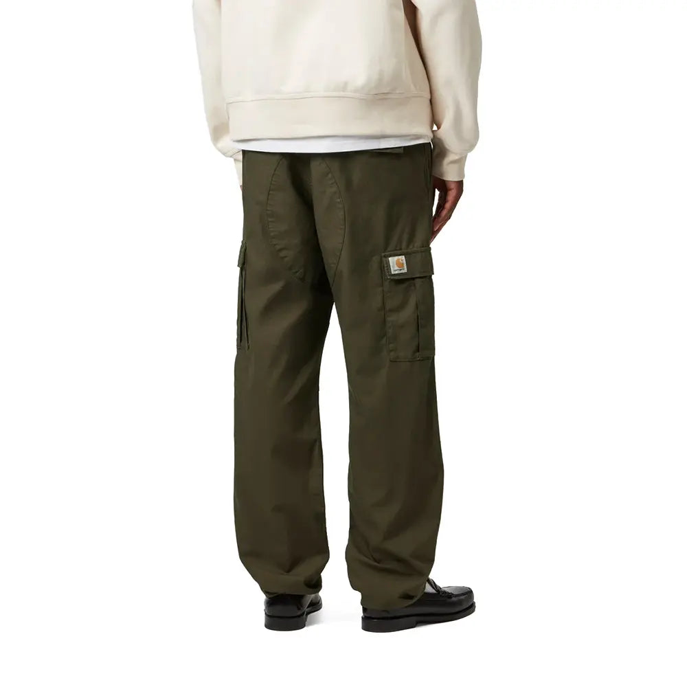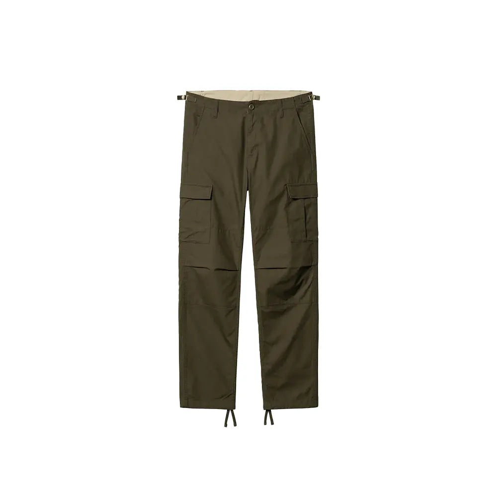 The Aviation Pant has a cargo-style silhouette and is constructed in a slim fit from Columbia ripstop, which is a midweight cotton fabric. It also features multiple pockets throughout, one of which has been embroidered with a Square Label. The fit can be adjusted via buckled straps at the waist and adjustable leg openings. The pant is slimmer than Carhartt WIP's Regular Cargo Pant .