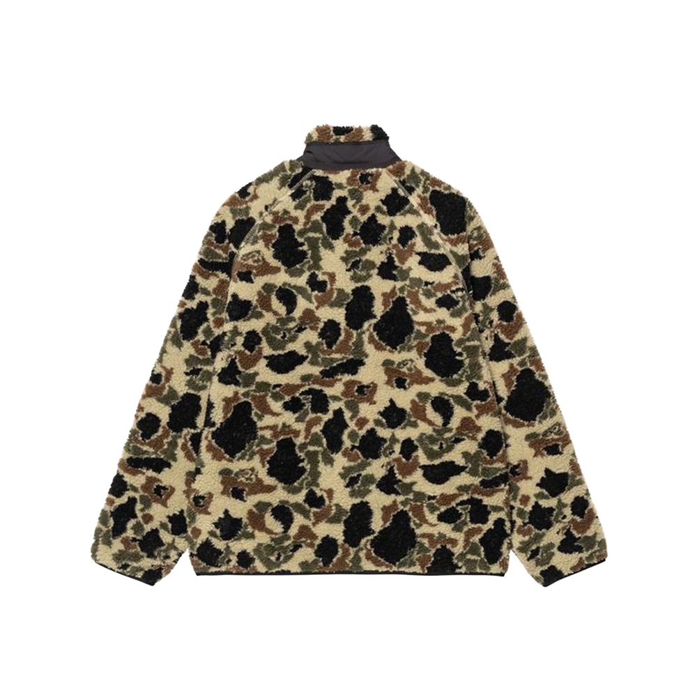 The Prentis Liner is a midweight style constructed from polyester pile. While some iterations of the Prentis Liner feature an allover block color, this style specifically has a jacquard outer shell depicting a camouflage design. Inside, the garment is lined with mesh at the body and nylon taffeta at the sleeves. It is detailed with a funnel neck, contrasting nylon taffeta chest pocket and woven Square Label.